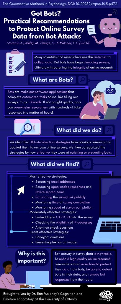 We identified 10 bot-detection strategies from previous research and applied them to our own online surveys. We then categorized the strategies by how effective they were at catching or preventing bots.