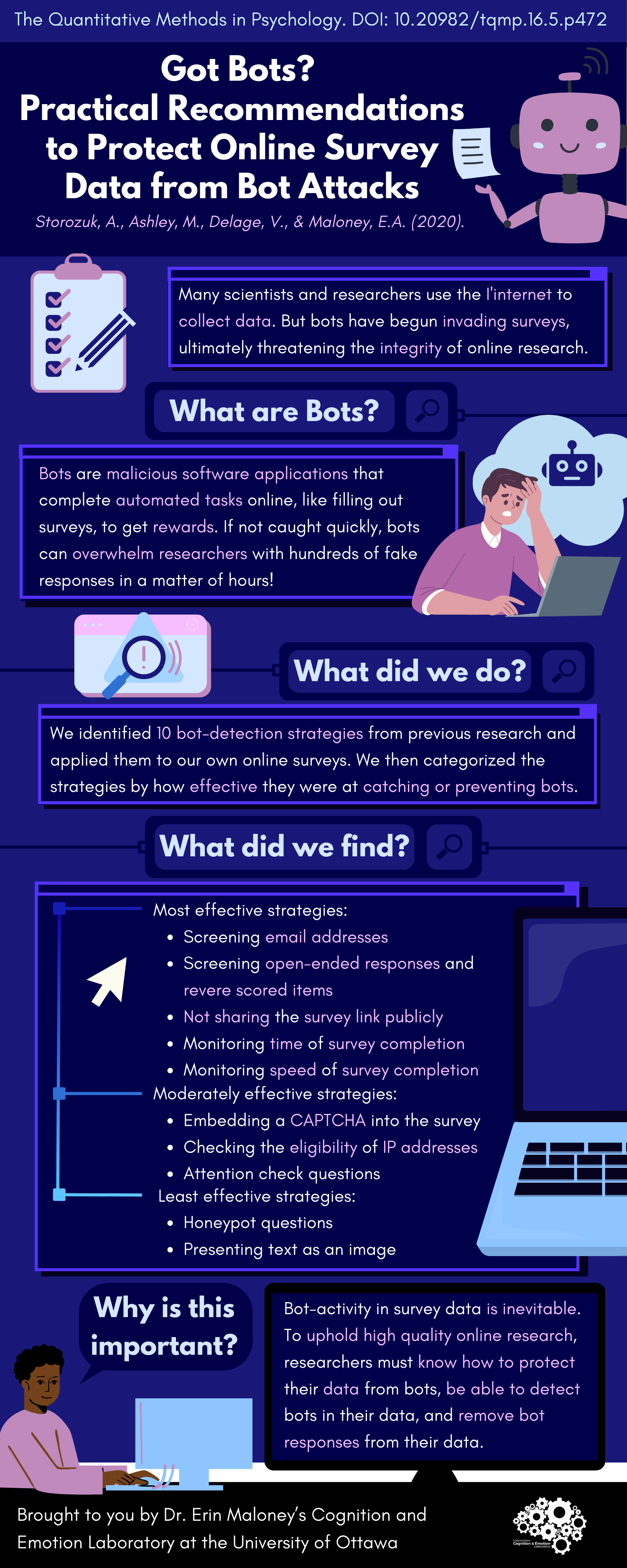 Bot-activity in survey data is inevitable. To uphold high quality online research, researchers must know how to protect their data from bots, be able to detect bots in their data, and remove bot responses from their data.