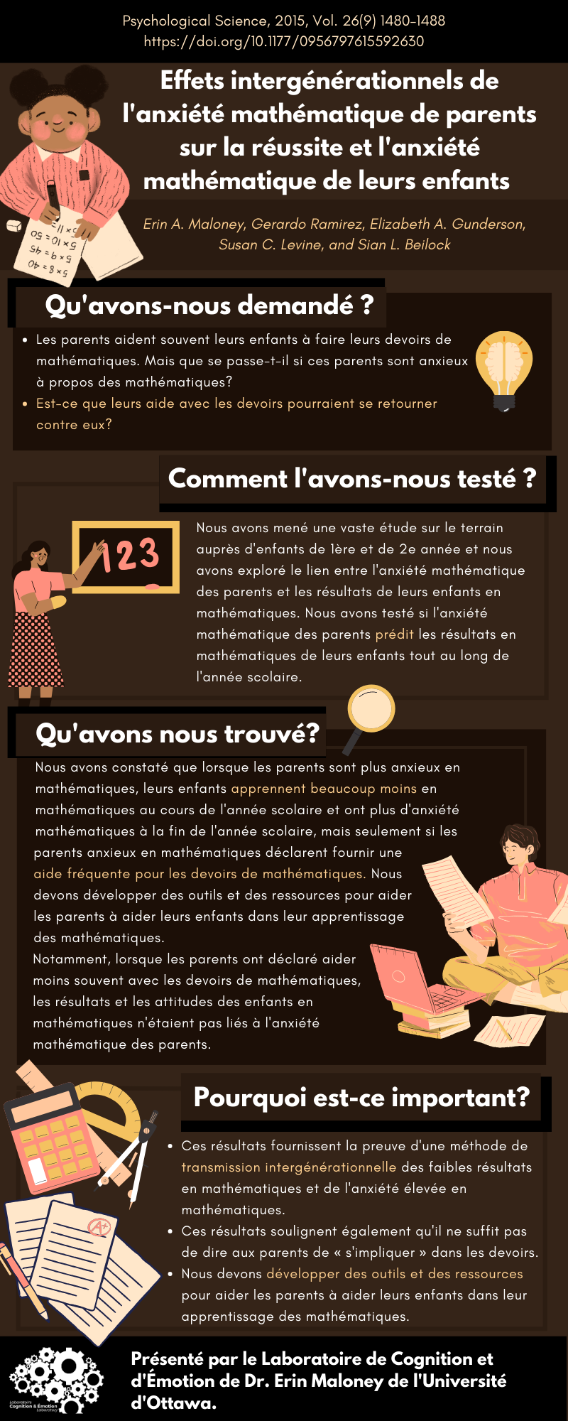- Nous avons constaté que lorsque les parents sont plus anxieux en mathématiques, leurs enfants apprennent beaucoup moins en mathématiques au cours de l’année scolaire et ont plus d’anxiété mathématiques à la fin de l’année scolaire, mais seulement si les parents anxieux en mathématiques déclarent fournir une aide fréquente pour les devoirs de mathématiques. Nous devons développer des outils et des ressources pour aider les parents à aider leurs enfants dans leur apprentissage des mathématiques.