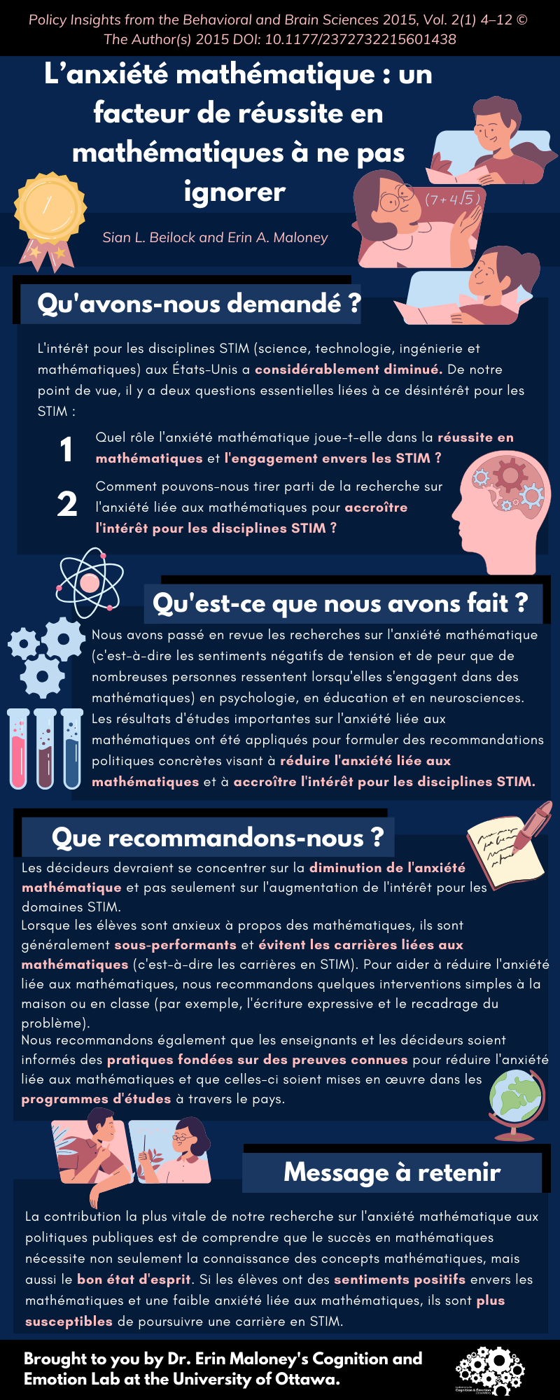 - La contribution la plus vitale de notre recherche sur l’anxiété mathématique aux politiques publiques est de comprendre que le succès en mathématiques nécessite non seulement la connaissance des concepts mathématiques, mais aussi le bon état d’esprit. Si les élèves ont des sentiments positifs envers les mathématiques et une faible anxiété liée aux mathématiques, ils sont plus susceptibles de poursuivre une carrière en STIM.