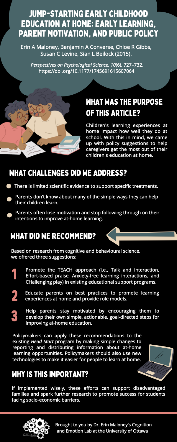 Promote the TEACH approach (i.e., Talk and interaction, Effort-based praise, Anxiety-free learning interactions, and CHallenging play) in existing educational support programs. Educate parents on best practices to promote learning experiences at home and provide role models. Help parents stay motivated by encouraging them to develop their own simple, actionable, goal-directed steps for improving at-home education.