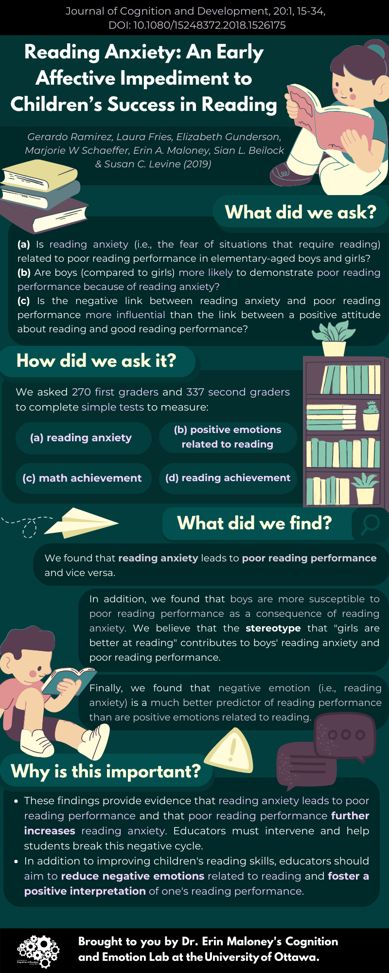 Why is this important? These findings provide evidence that reading anxiety leads to poor reading performance and that poor reading performance further increases reading anxiety. Educators must intervene and help students break this negative cycle by helping children improve their reading skills and by fostering a positive interpretation of one’s reading performance to reduce negative emotions related to reading.