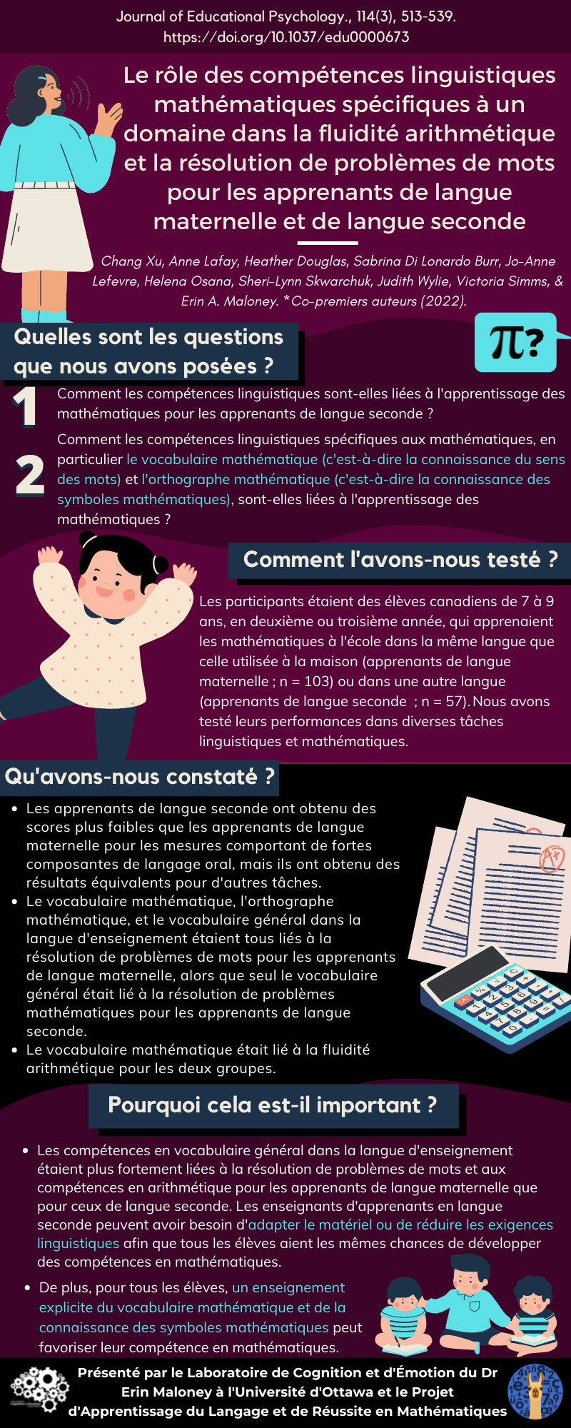 Présenté par le Laboratoire de Cognition et d’Émotion du Dr Erin Maloney à l’Université d’Ottawa et le Projet d’Apprentissage du Langage et de Réussite en Mathématiques.