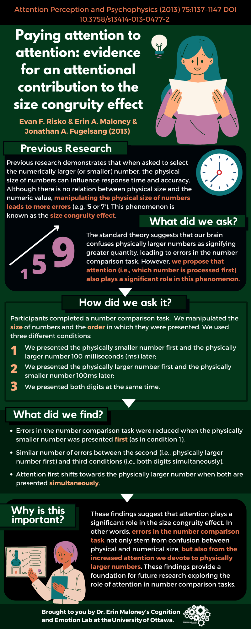 Why is this important? These findings suggest that attention plays a significant role in the size congruity effect. In other words, errors in the number comparison task not only stem from confusion between physical and numerical size, but also from the increased attention we devote to physically larger numbers. These findings provide a foundation for future research exploring the role of attention in number comparison tasks.