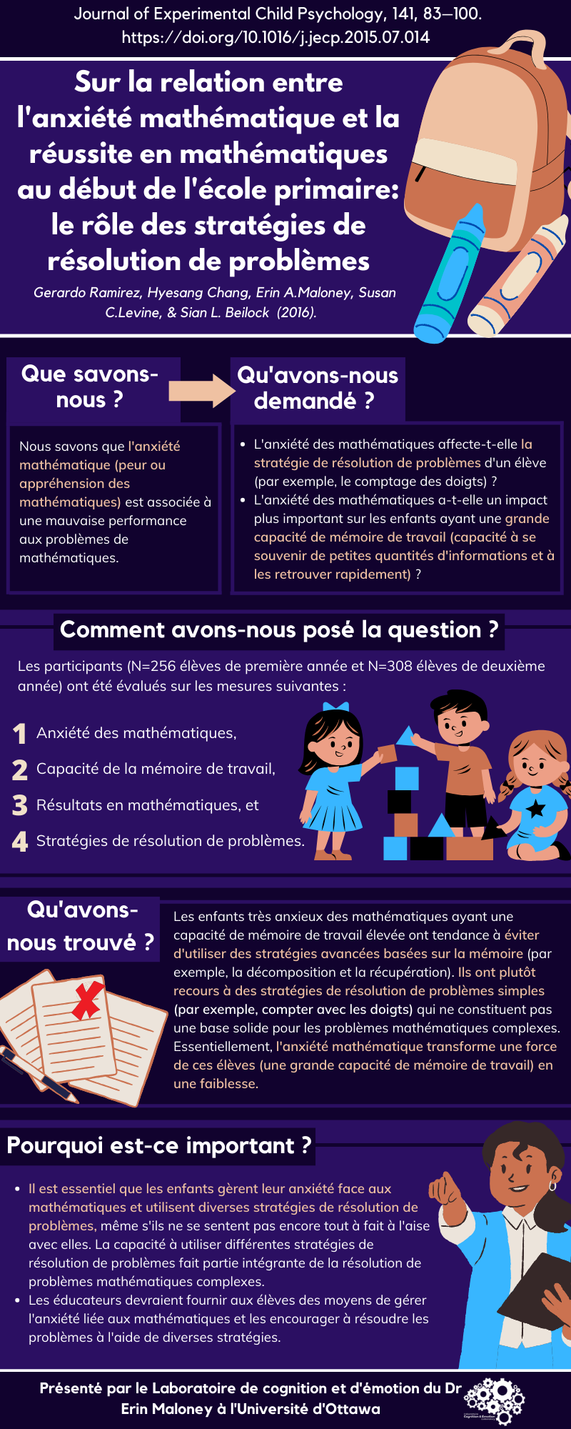 Qu’avons-nous trouvé ? Les enfants très anxieux des mathématiques ayant une capacité de mémoire de travail élevée ont tendance à éviter d’utiliser des stratégies avancées basées sur la mémoire (par exemple, la décomposition et la récupération). Ils ont plutôt recours à des stratégies de résolution de problèmes simples (par exemple, compter avec les doigts) qui ne constituent pas une base solide pour les problèmes mathématiques complexes. Essentiellement, l’anxiété mathématique transforme une force de ces élèves (une grande capacité de mémoire de travail) en une faiblesse.