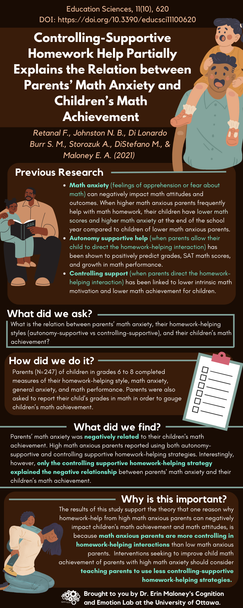 The results of this study support the theory that one reason why homework-help from high math anxious parents can negatively impact children’s math achievement and math attitudes, is because math anxious parents are more controlling in homework-helping interactions than low math anxious parents.