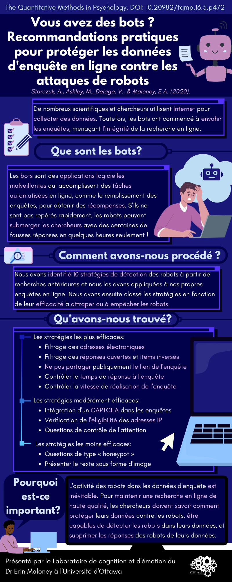 L’activité des robots dans les données d’enquête est inévitable. Pour maintenir une recherche en ligne de haute qualité, les chercheurs doivent savoir comment protéger leurs données contre les robots, être capables de détecter les robots dans leurs données, et supprimer les réponses des robots de leurs données.