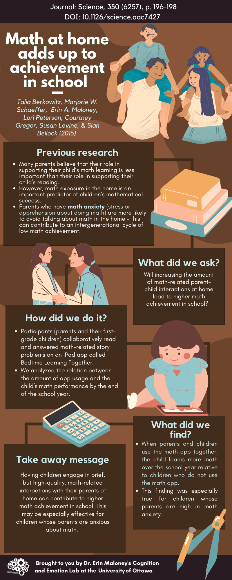 Having children engage in brief, but high-quality, math-related interactions with their parents at home can contribute to higher math achievement in school. This may be especially effective for children whose parents are anxious about math.