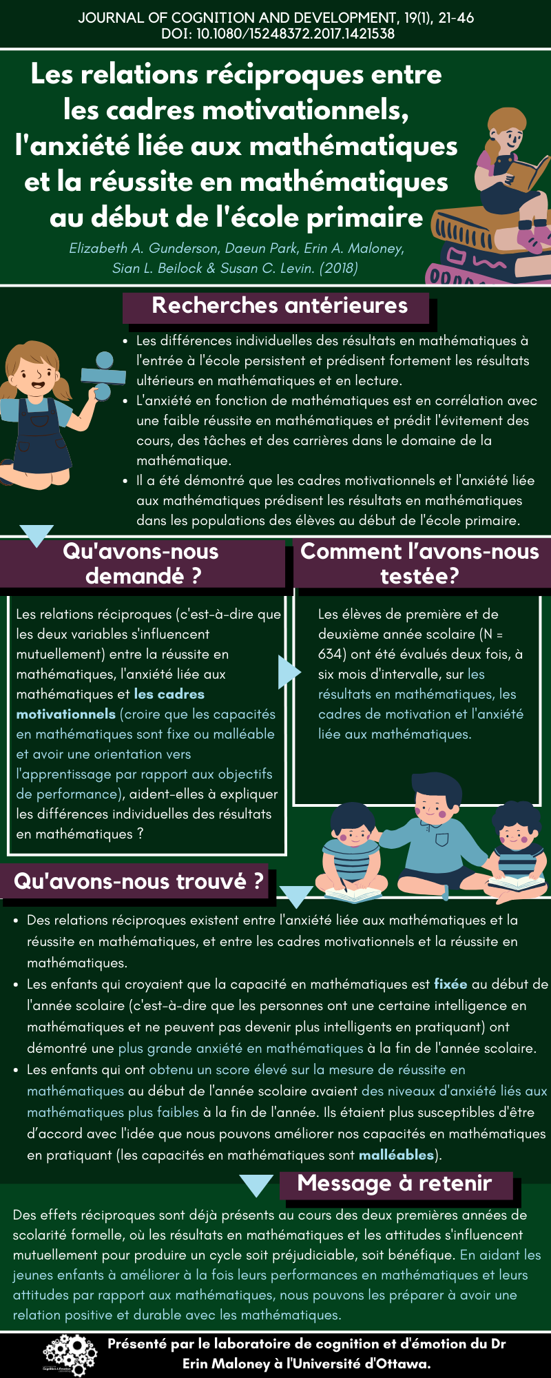 -Il a été démontré que les cadres motivationnels et l’anxiété liée aux mathématiques prédisent les résultats en mathématiques dans les populations des élèves au début de l’école primaire.