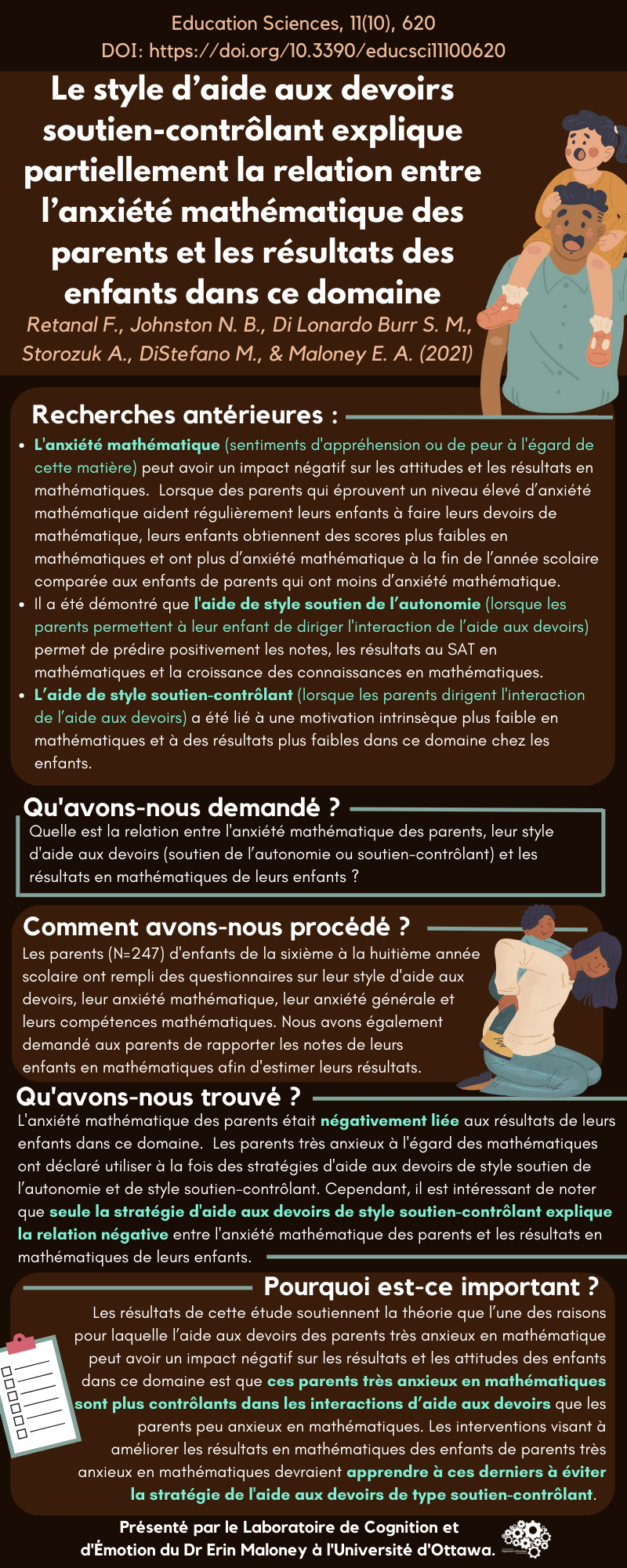 Le style d’aide aux devoirs soutien-contrôlant explique partiellement la relation entre l’anxiété mathématique des parents et les résultats des enfants dans ce domaine.