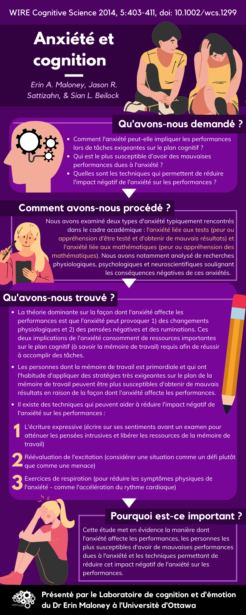 La théorie dominante sur la façon dont l’anxiété affecte les performances est que l’anxiété peut provoquer 1) des changements physiologiques et 2) des pensées négatives et des ruminations. Ces deux implications de l’anxiété consomment de ressources importantes sur le plan cognitif (à savoir la mémoire de travail) requis afin de réussir à accomplir des tâches.