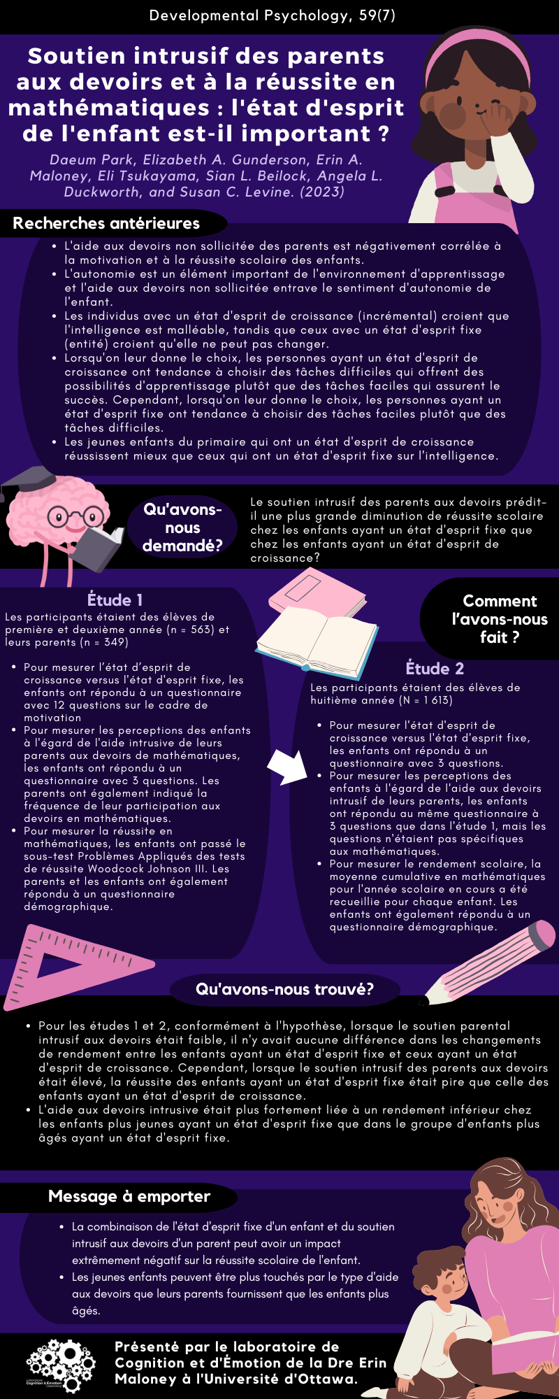 - Pour mesurer l’état d’esprit de Croissance versus l’état d’esprit Fixe, les enfants ont répondu à un questionnaire avec 3 questions. Pour mesurer les perceptions des enfants à l’égard de l’aide aux devoirs intrusif de leurs parents, les enfants ont répondu au même questionnaire à 3 questions que dans l’étude 1, mais les questions n’étaient pas spécifiques aux mathématiques. Pour mesurer le Rendement Scolaire, la moyenne cumulative en mathématiques pour l’année scolaire en cours a été recueillie pour chaque enfant. Les enfants ont également répondu à un questionnaire démographique.