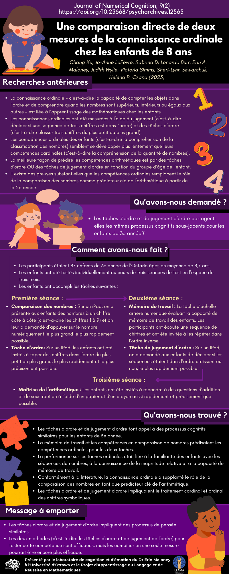 - La performance sur les tâches ordinales était liée à la familiarité des enfants avec les séquences de nombres, à la connaissance de la magnitude relative et à la capacité de mémoire de travail.