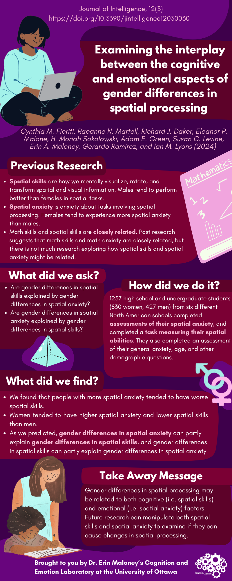 · Gender differences in spatial processing may be related to both cognitive (i.e. spatial skills) and emotional (i.e. spatial anxiety) factors. Future research can manipulate both spatial skills and spatial anxiety to examine if they can cause changes in spatial processing.